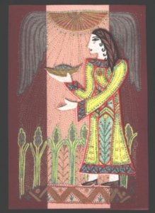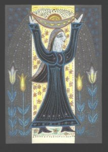Mozdulatok érkeztek meg a testembe: A karjaimat rombusz alakban a fejem elé helyeztem. A két kezem ujjai egymáson, kifelé tekintettek, a kezeim hátoldala a harmadik szememre illeszkedett. Ez egy nagyon erős testtartás volt, ami behívta a csillagkódokat, és a csillagokkal, kozmosszal kapcsolatos információkat. Behívta annak kozmikus képét, hogy hogyan lehet egy aranykori életformát létrehozni a Földön. Teljesen befogadó voltam erre az isteni/istennői vízióra. Amikor teljesen megérkezett ez a kép, még mindig ugyanazzal a kéztartással, ugyanúgy kifelé tekintve az égre elkezdtem hátrálni. Végig a szőnyeg szélén , majd oldalra fordulva a Szerelem papnőjével szemben álltam, még mindig a harmadik szemet megnyitó kéztartásban. A szerelem papnő reagált először a kódokra és a kozmikus energiára, méghozzá tánccal. Lényegében a NEF alapgyakorlat elejét táncolta el, majd odafordult a mellette ülő papnőhöz, aki az emberek közötti kapcsolatok megszövésének misztériumait képviselte. Ő szintén reagálni kezdett a rajta keresztül érkező ősképekre. A közösségszövőben az erő képeket keltett: sok-sok felnőtt de még inkább gyerek képét, akik együtt boldogok voltak, játszottak, fonták a kislányok haját. Majd a természettel való kapcsolatot megszövő papnő felé fordult, akit kézen fogva hozott be közénk. Benne kis bizonytalanság volt: hová visznek vajon? Ugyanakkor bizalom is: szelíden jött velük.